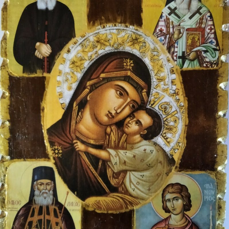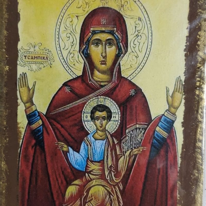 Η αναπαράσταση της Παναγίας σε προχωρημένη εγκυμοσύνη είναι από τις παλαιότερες στη βυζαντινή παράδοση. Εικόνα βασισμένη σε παλιό γνωστό σχέδιο, με ανάγλυφο χρυσό περιμετρικά του ξύλου και ζωντανά χρώματα.